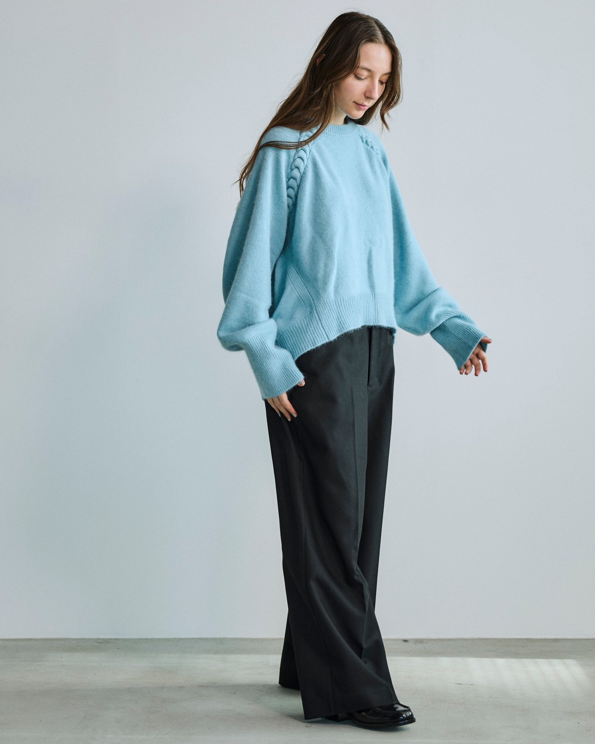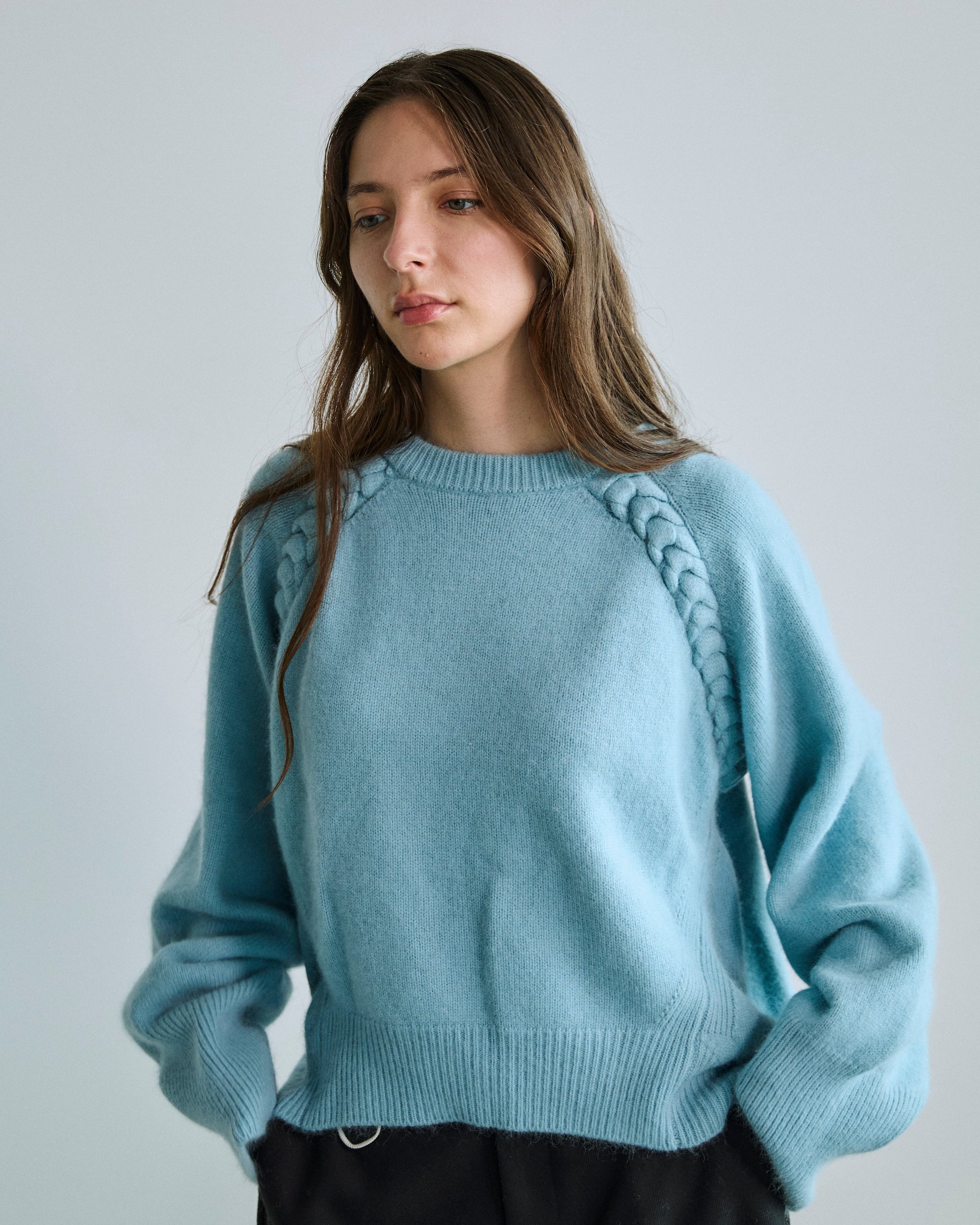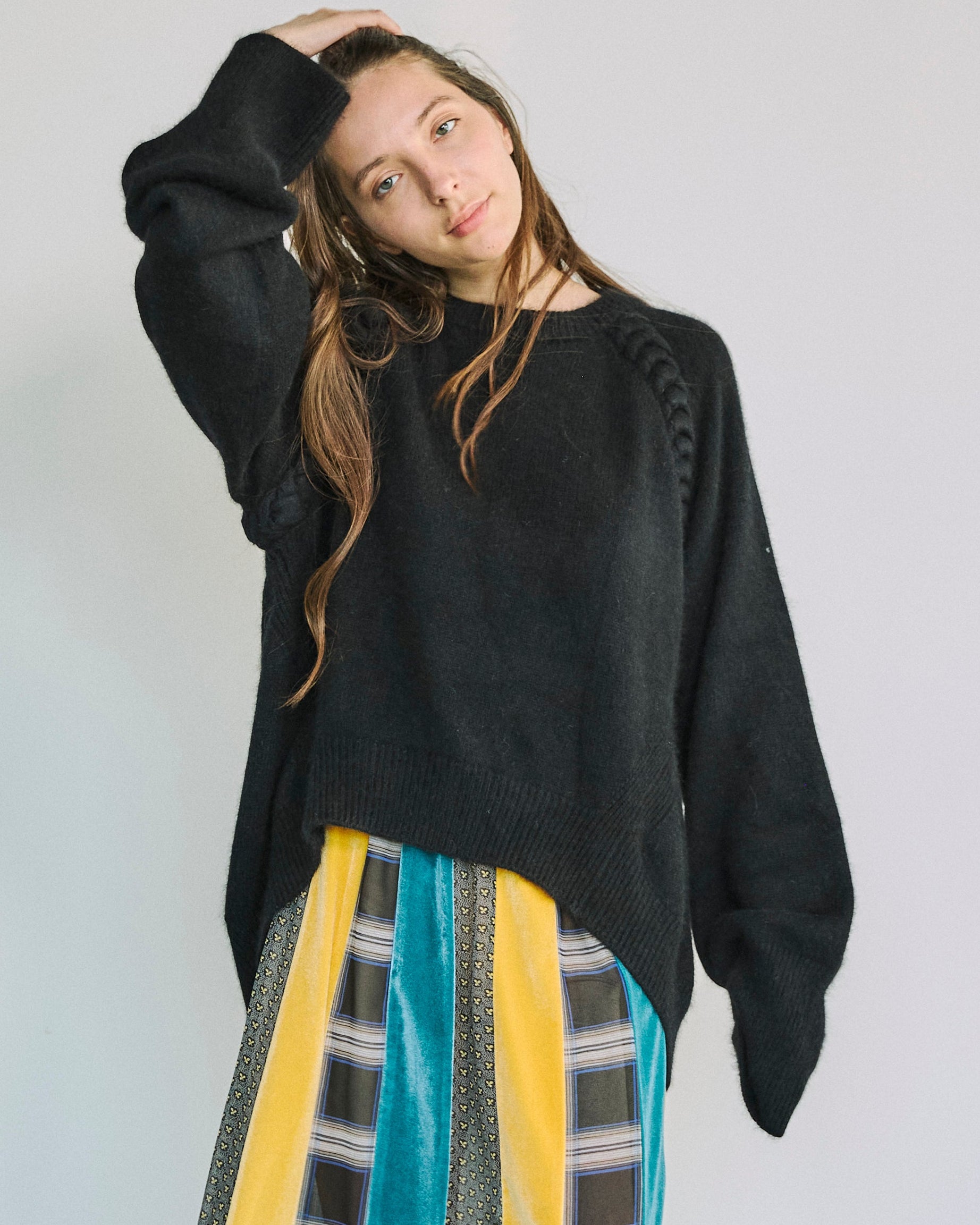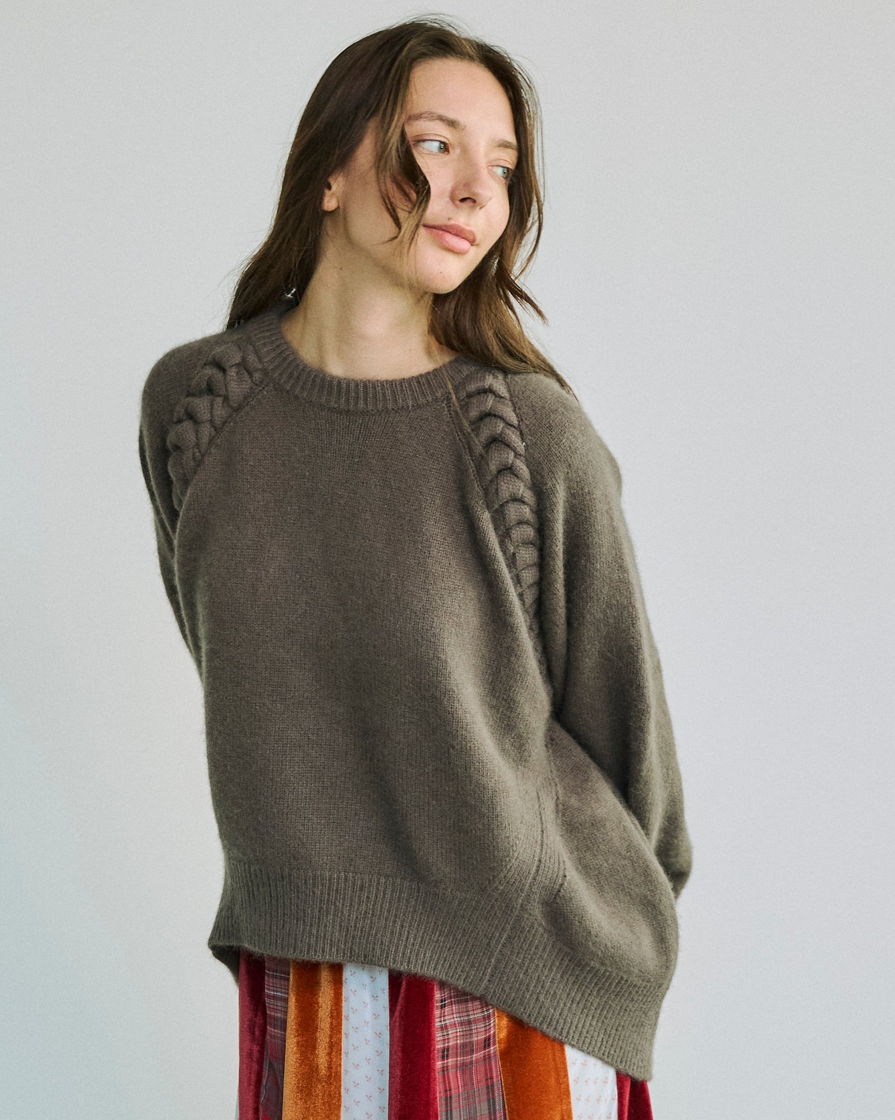 シンプルなロングスリーブニットに、チェーンを連想させる編み込みをあしらったアクセントデザイン。