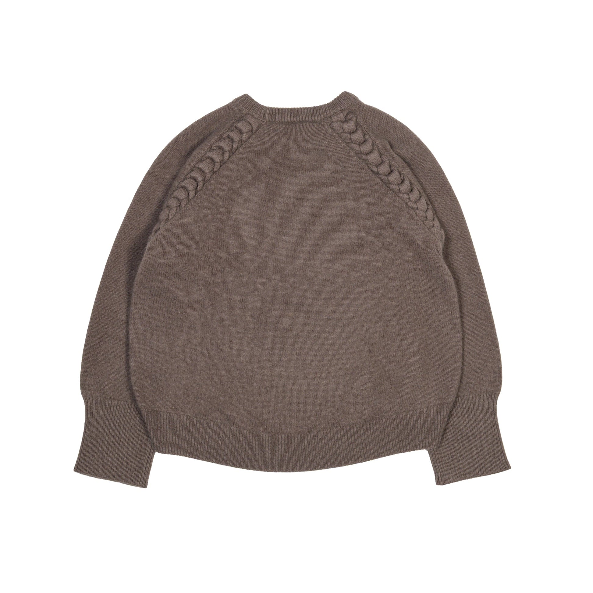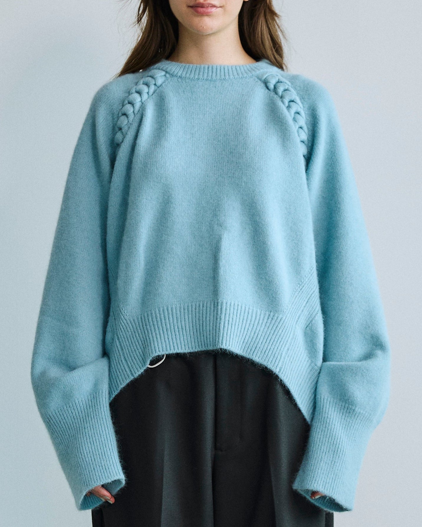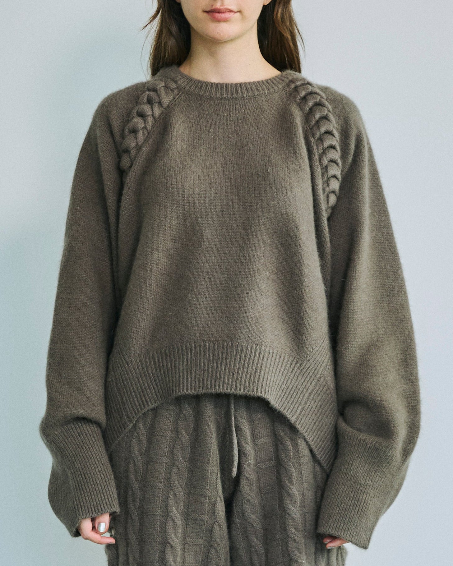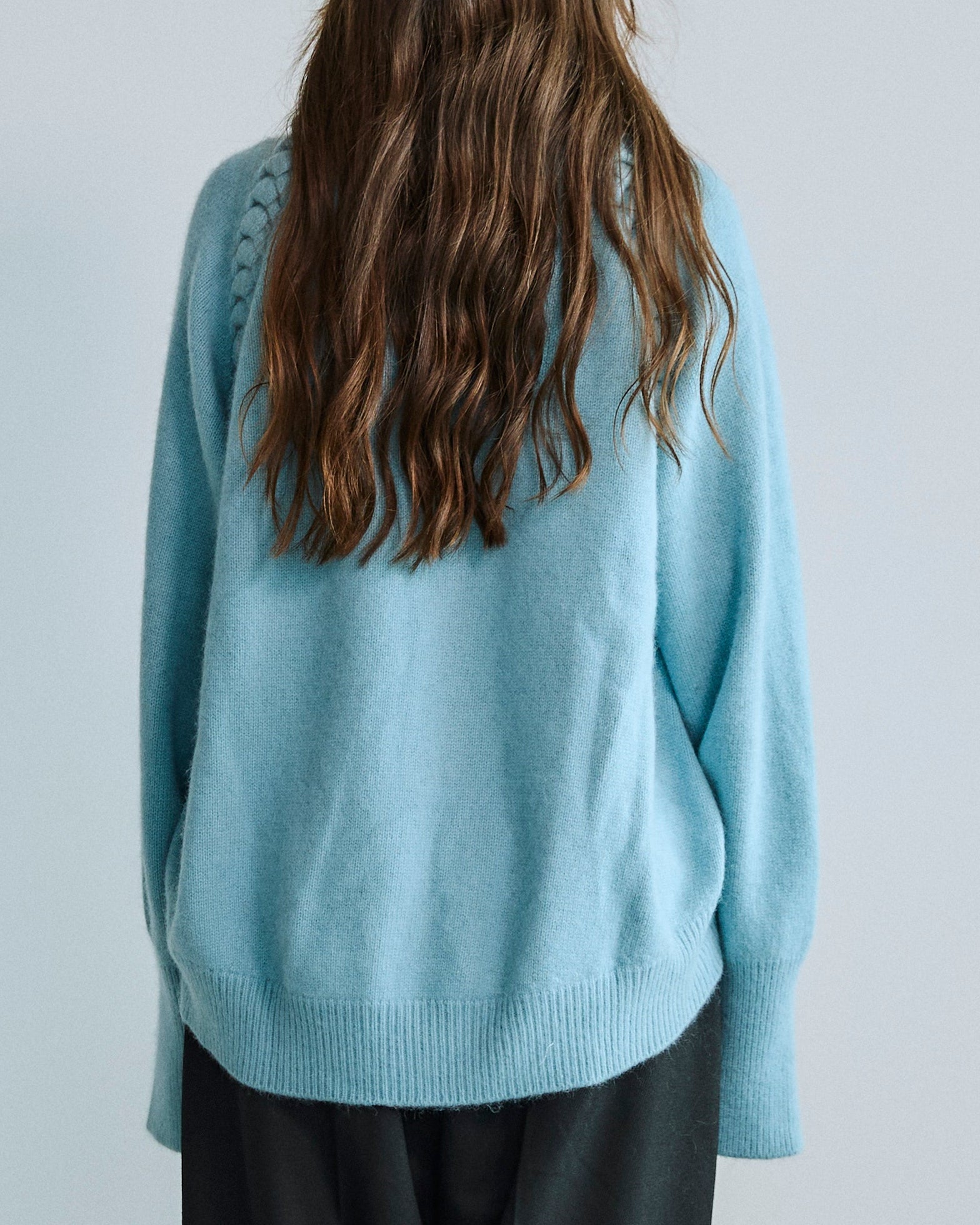 シンプルなロングスリーブニットに、チェーンを連想させる編み込みをあしらったアクセントデザイン。