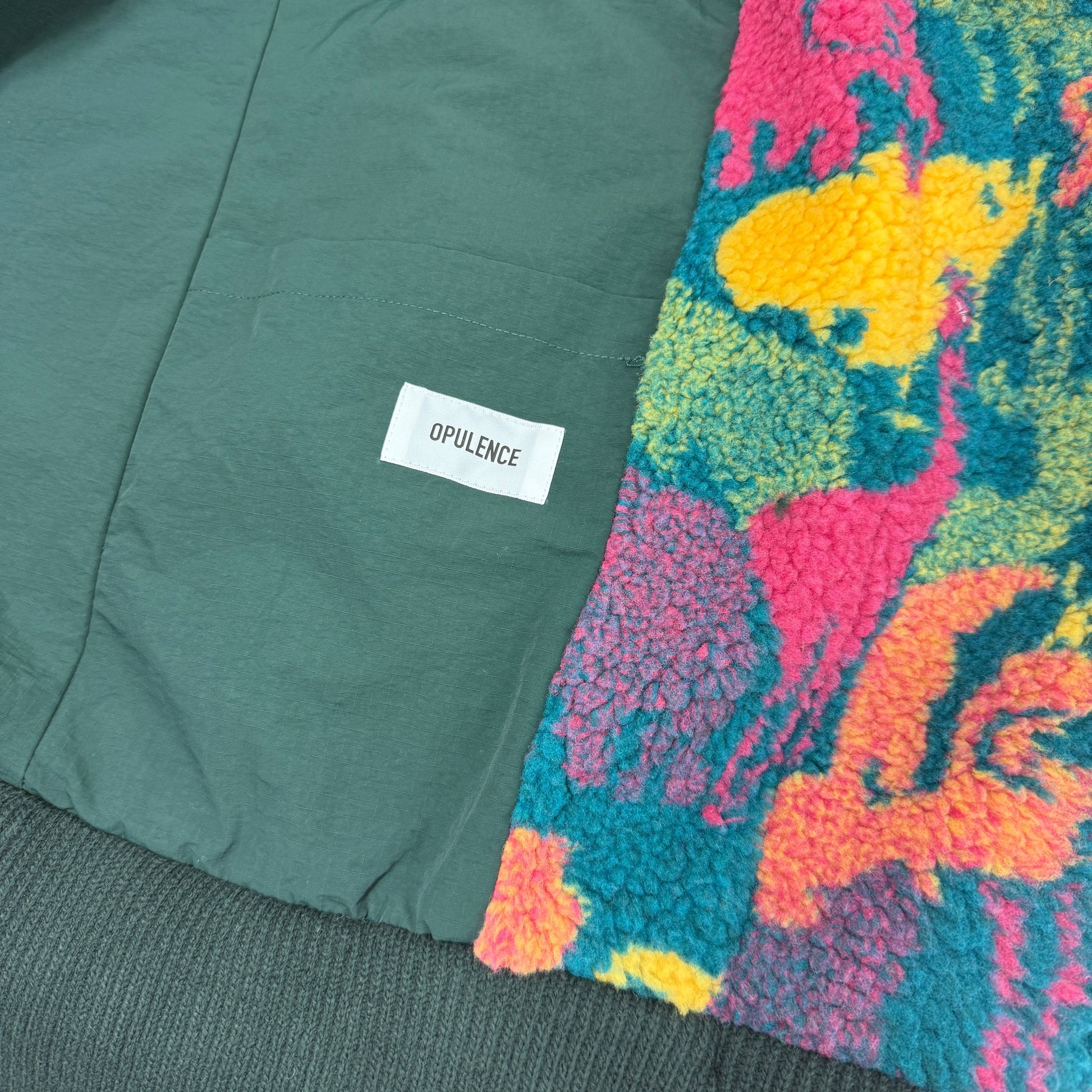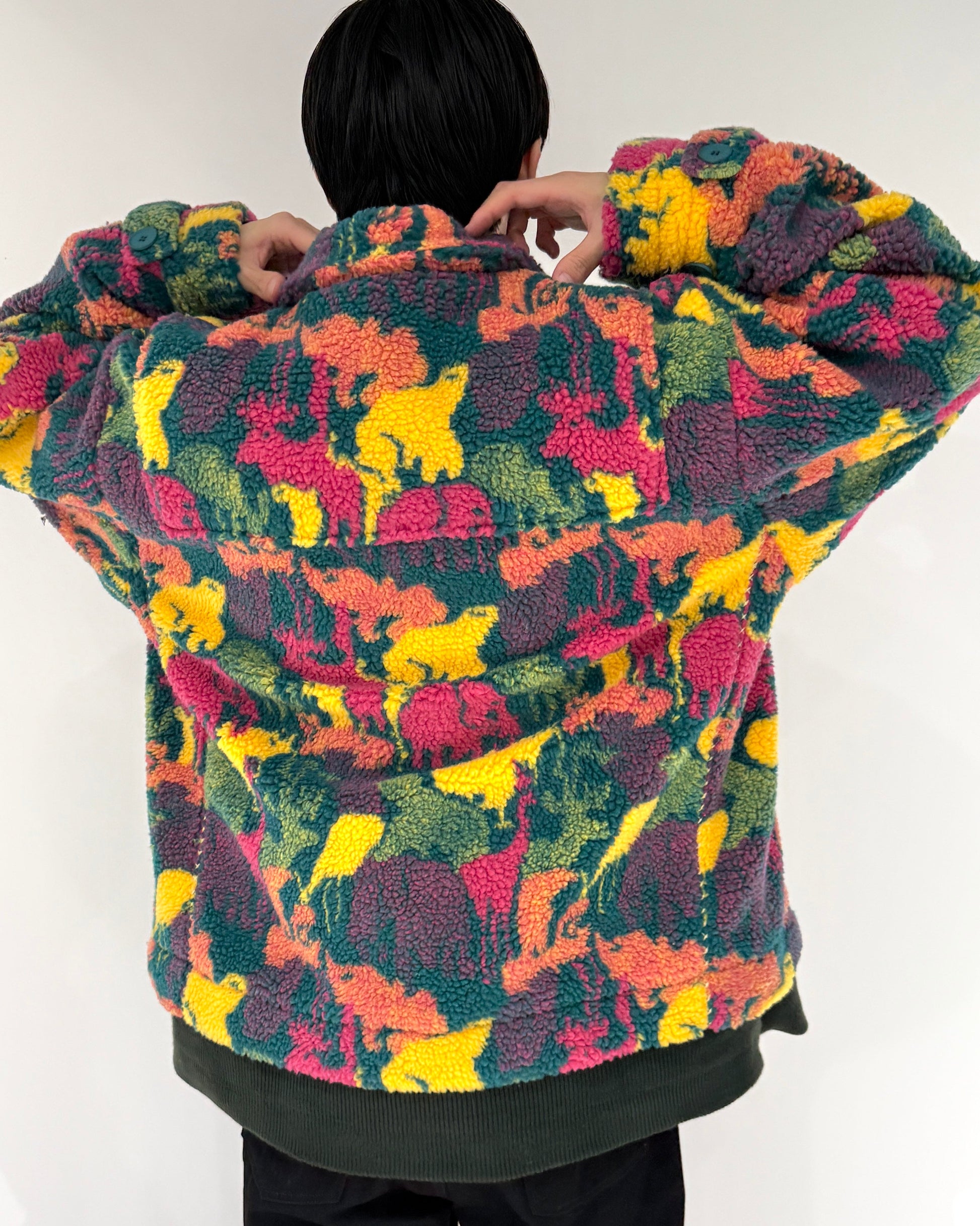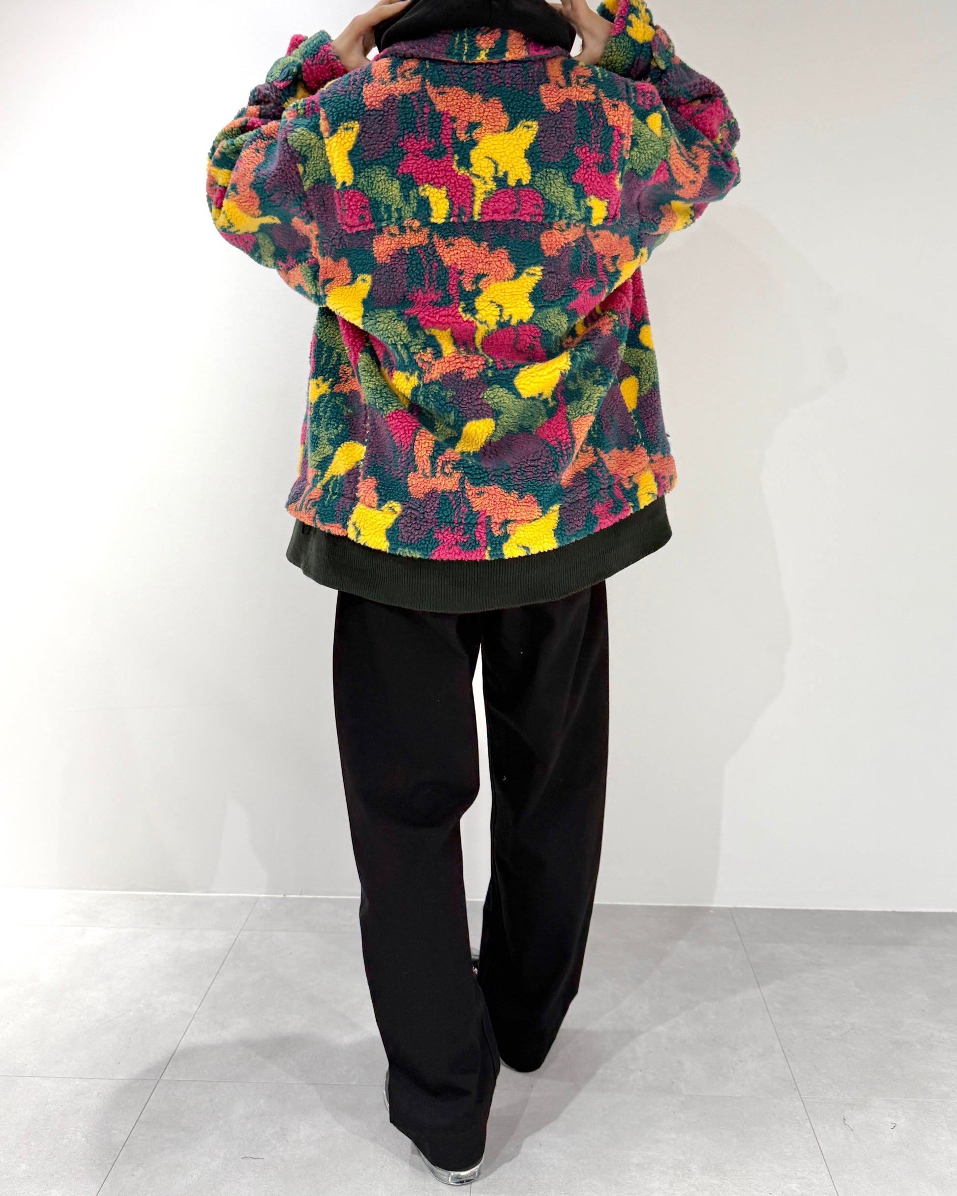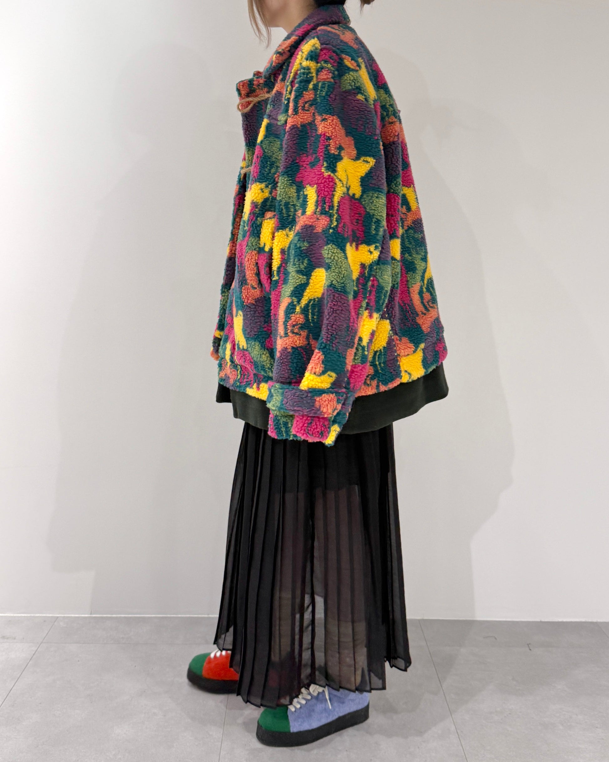 大胆なマルチカラーのアニマル柄ボアで仕立てた、存在感抜群のアウター。