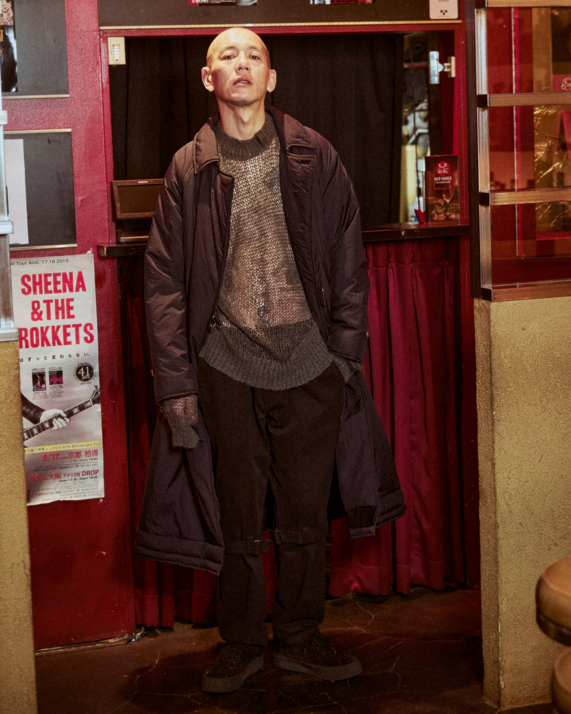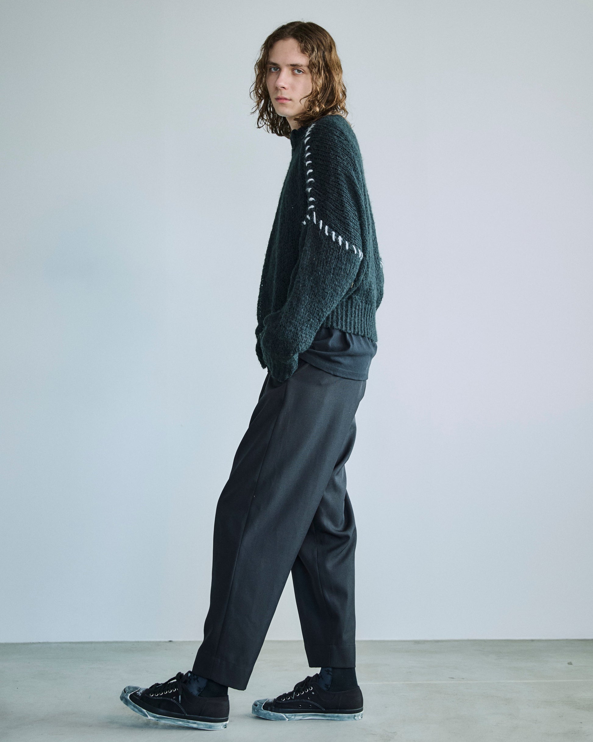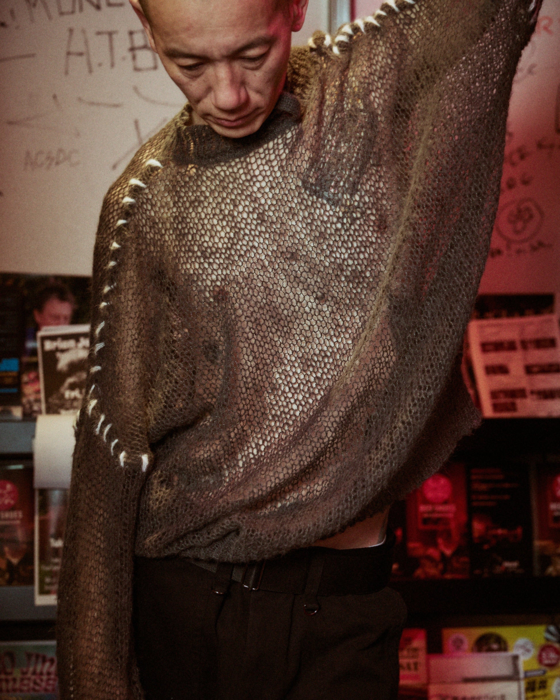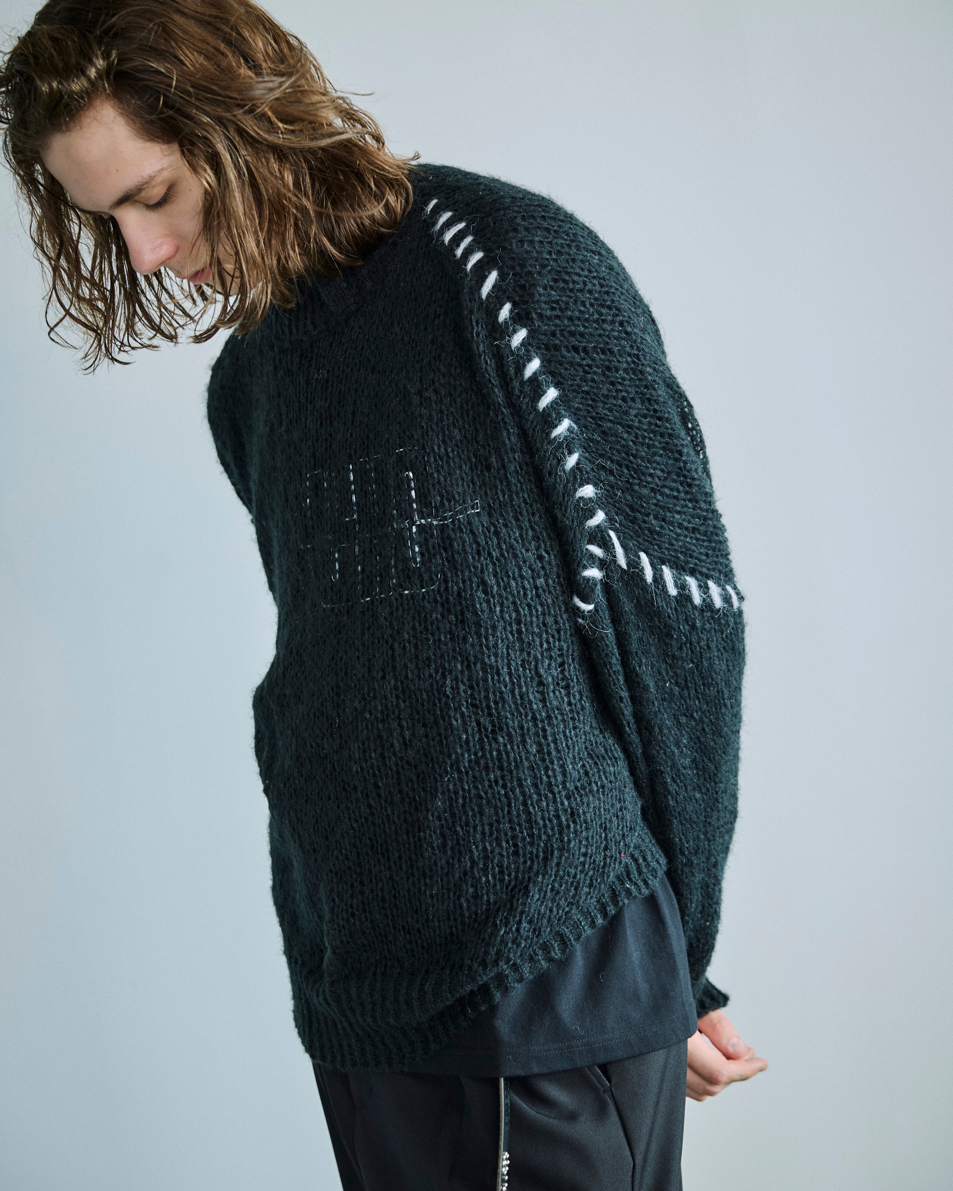 ハンドステッチをあしらったアクセントが、パンクなムードを添えるユニークな一着。