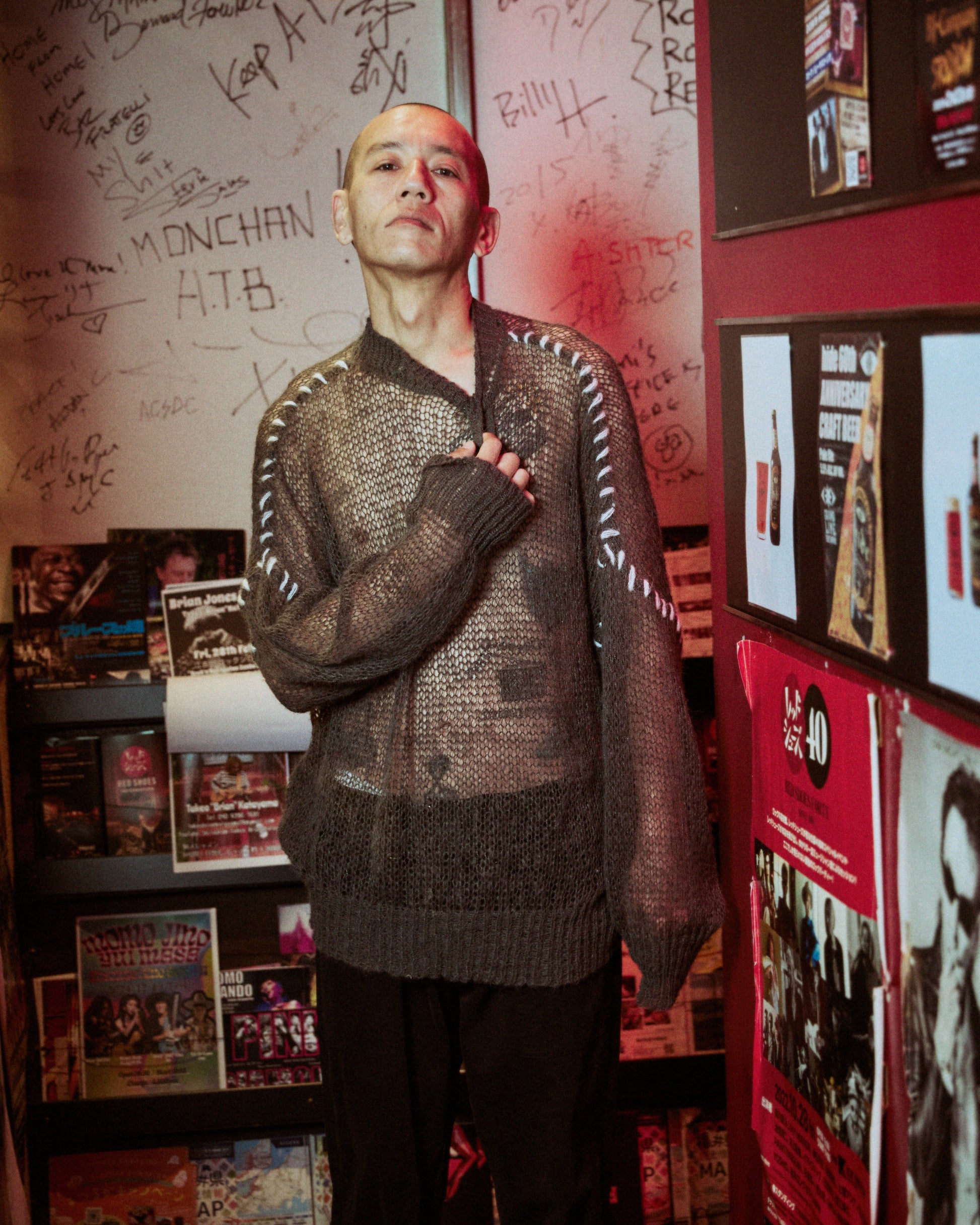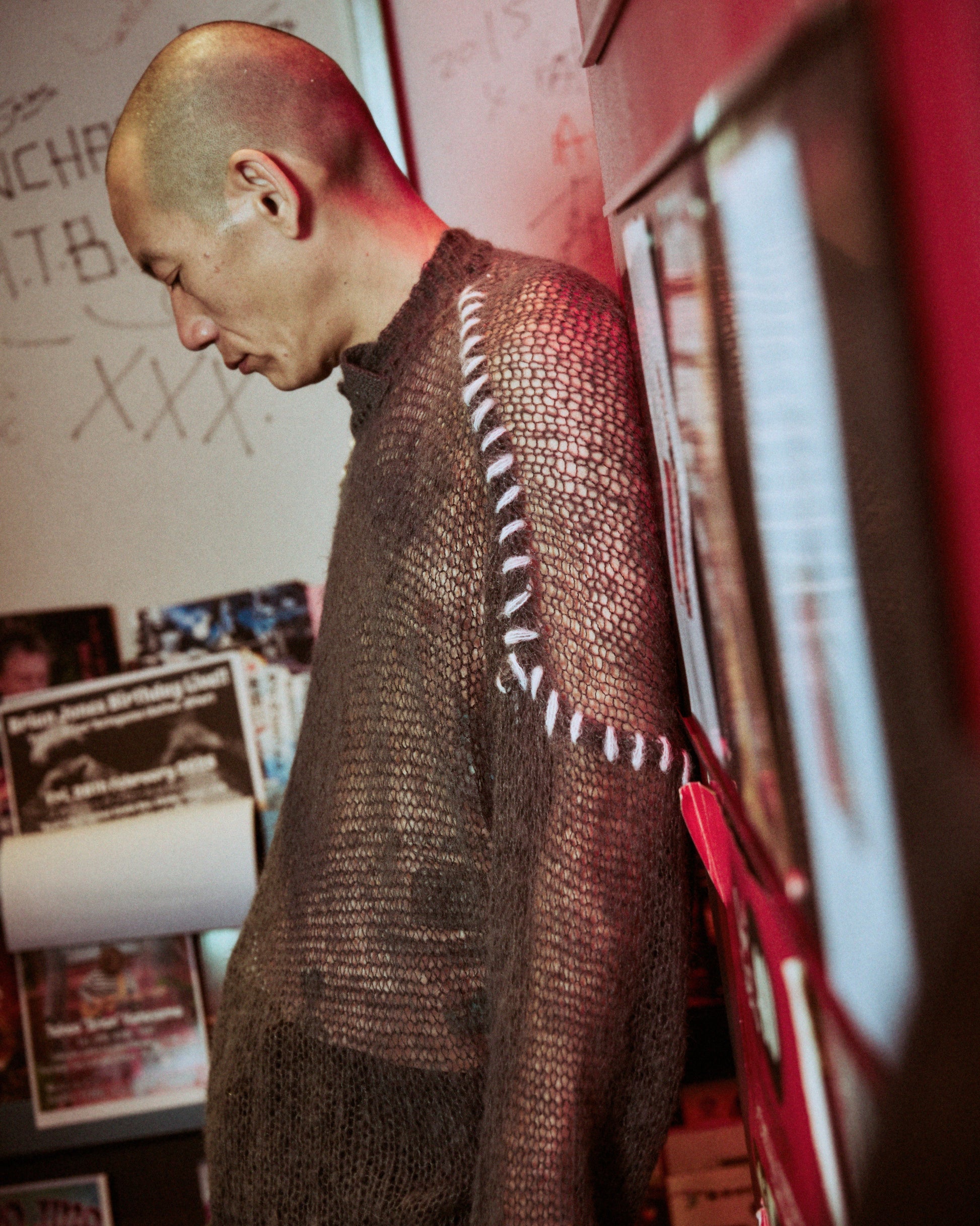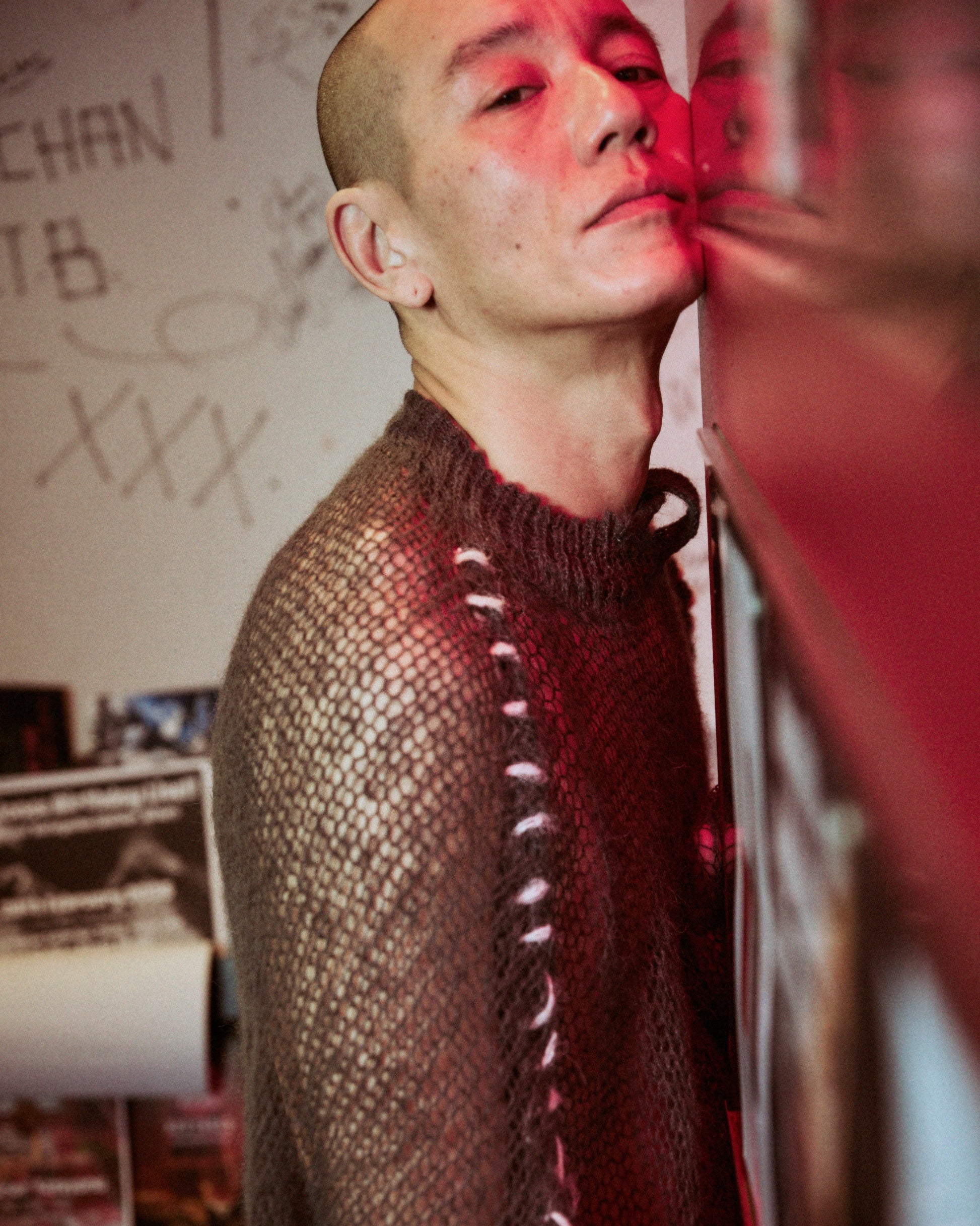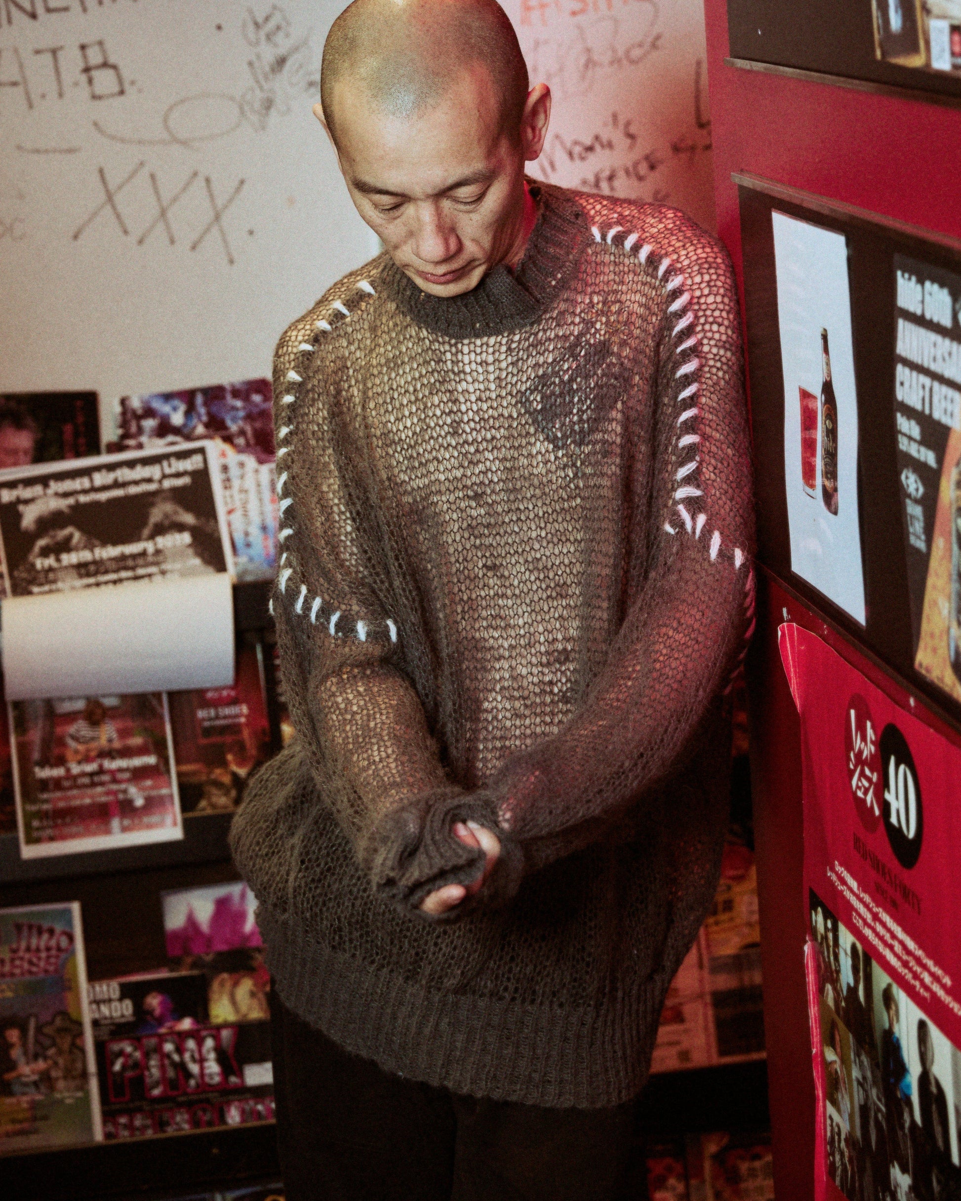 ハンドステッチをあしらったアクセントが、パンクなムードを添えるユニークな一着。