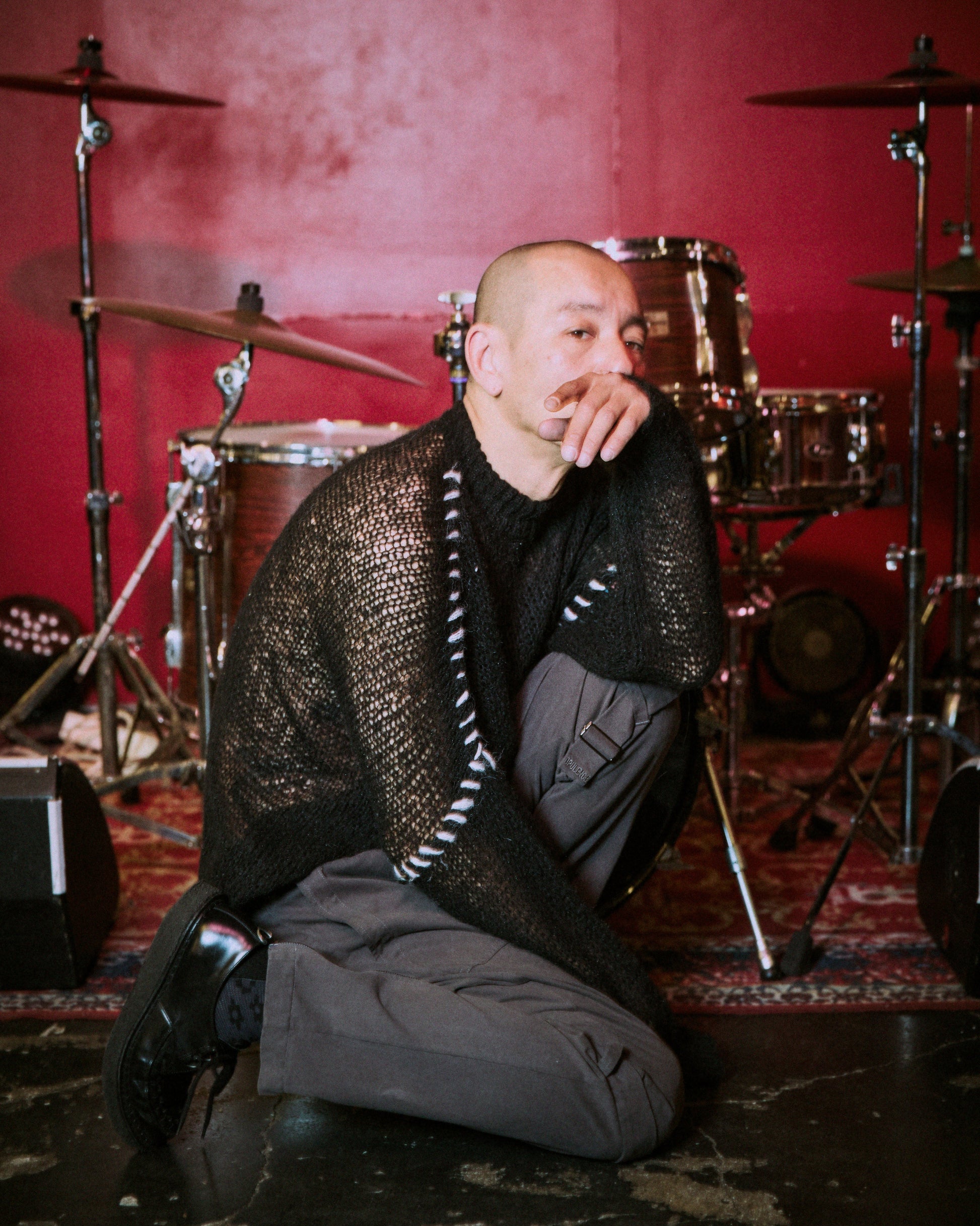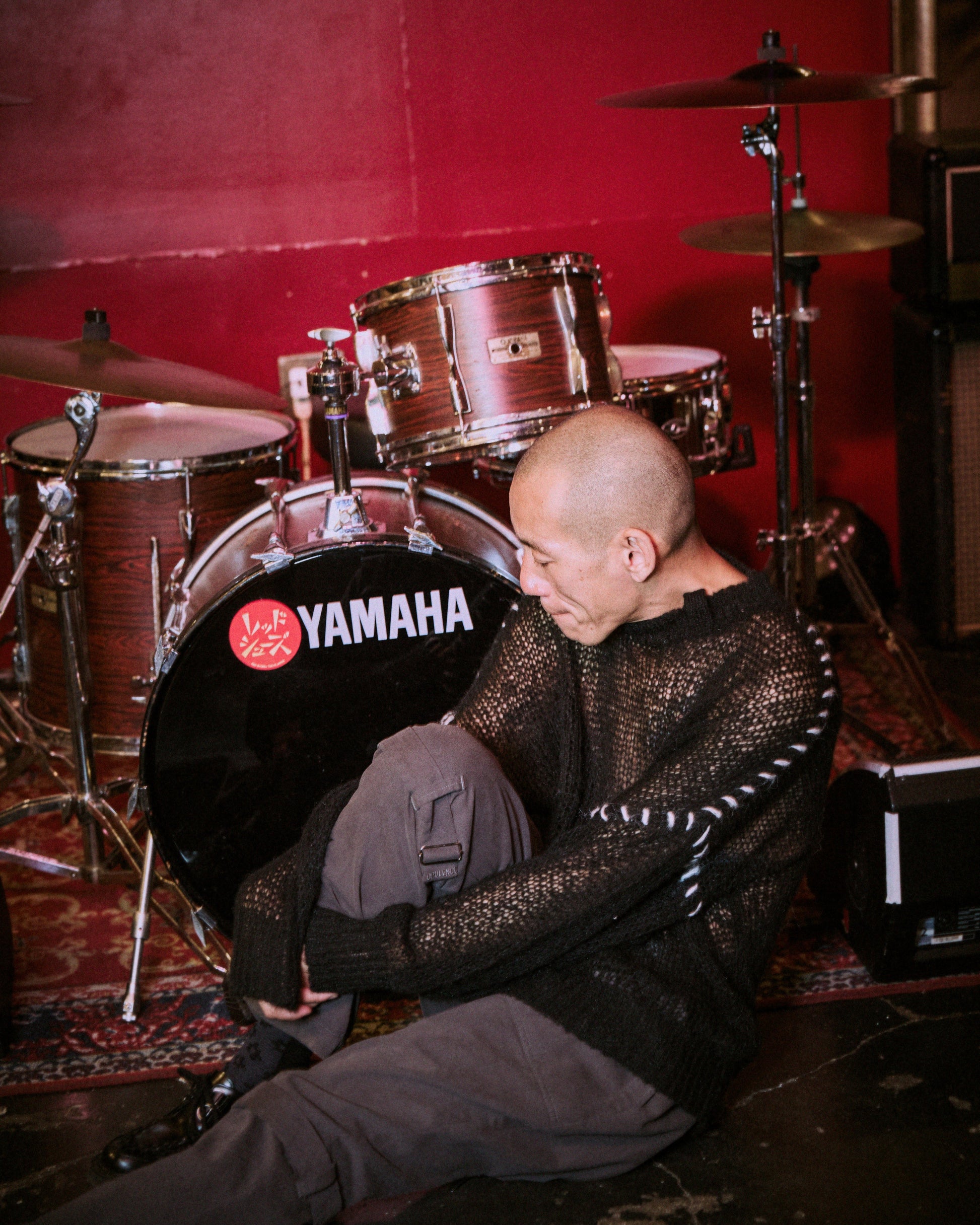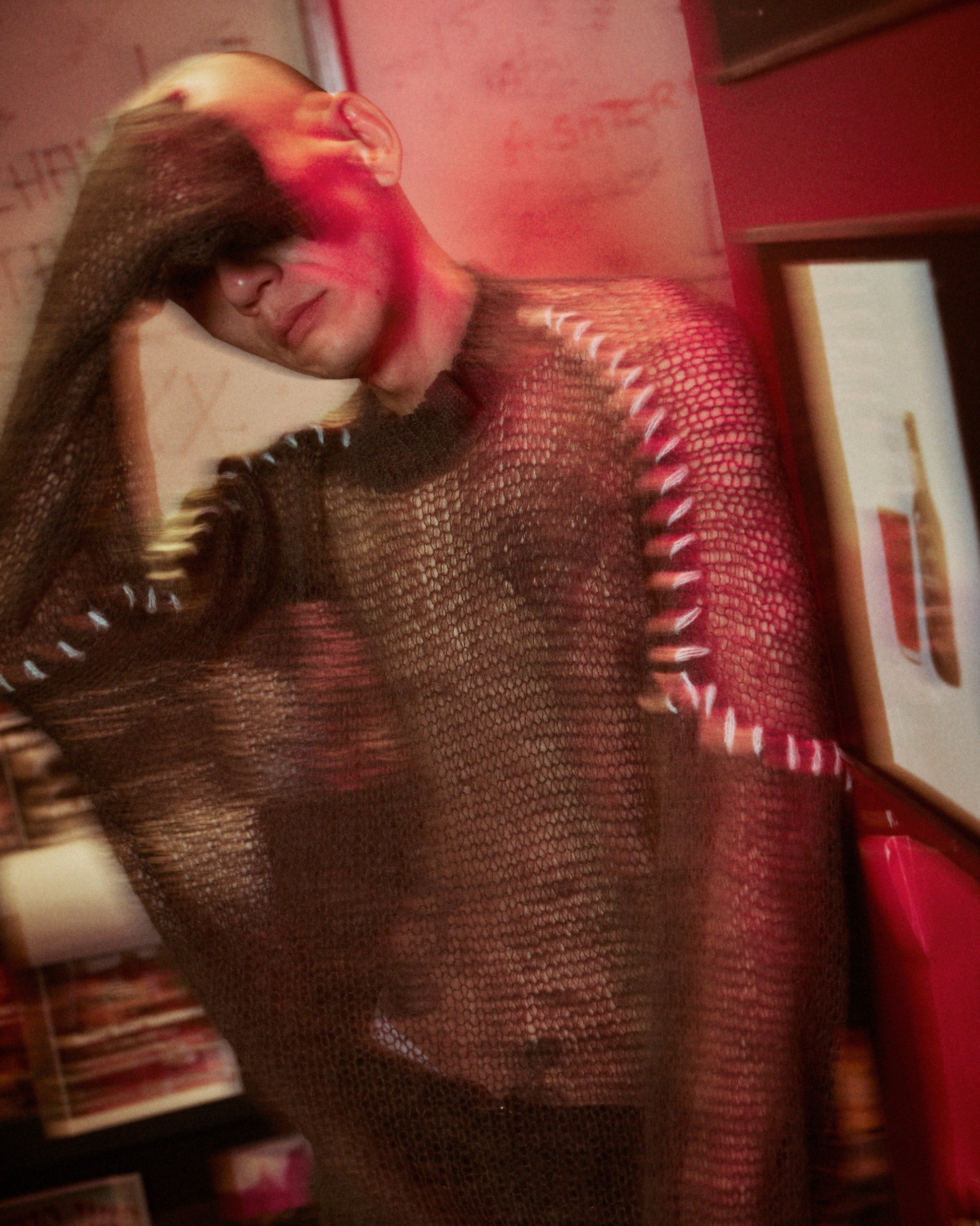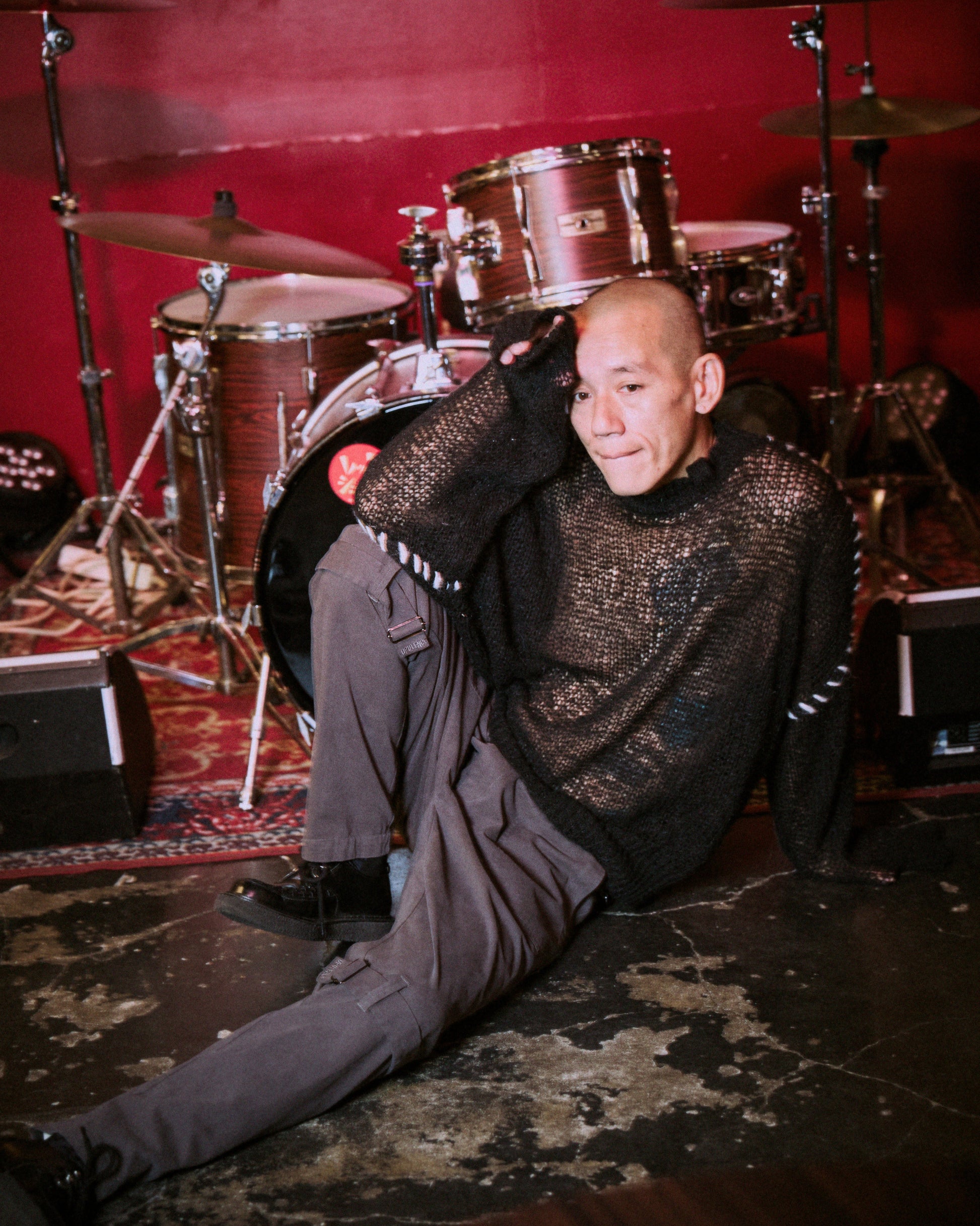 ハンドステッチをあしらったアクセントが、パンクなムードを添えるユニークな一着。