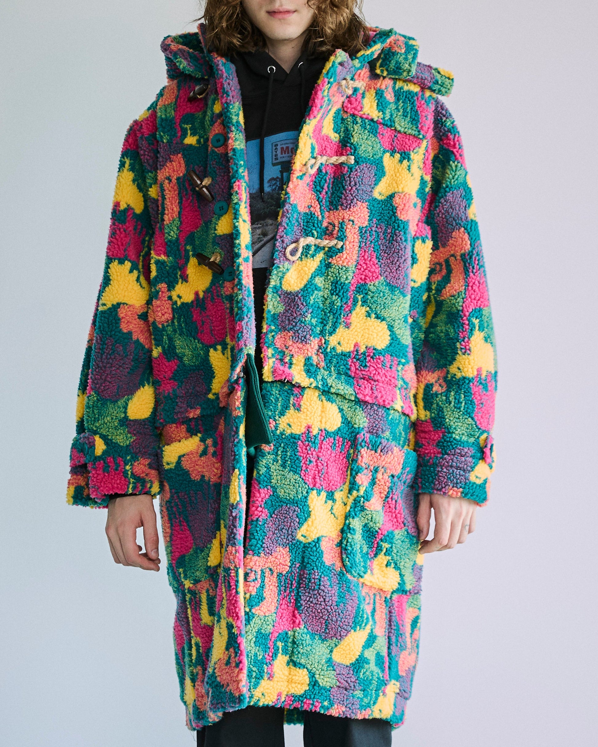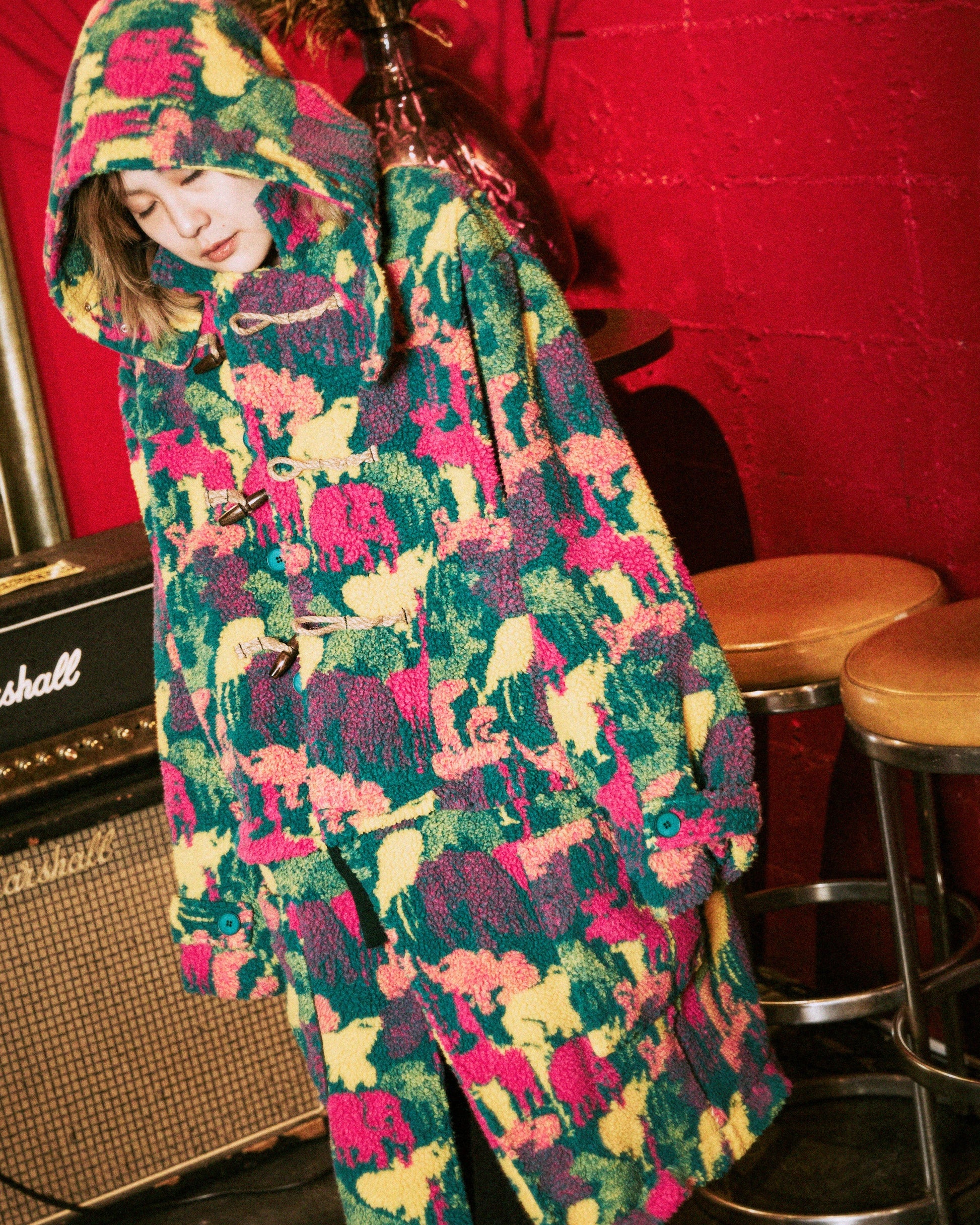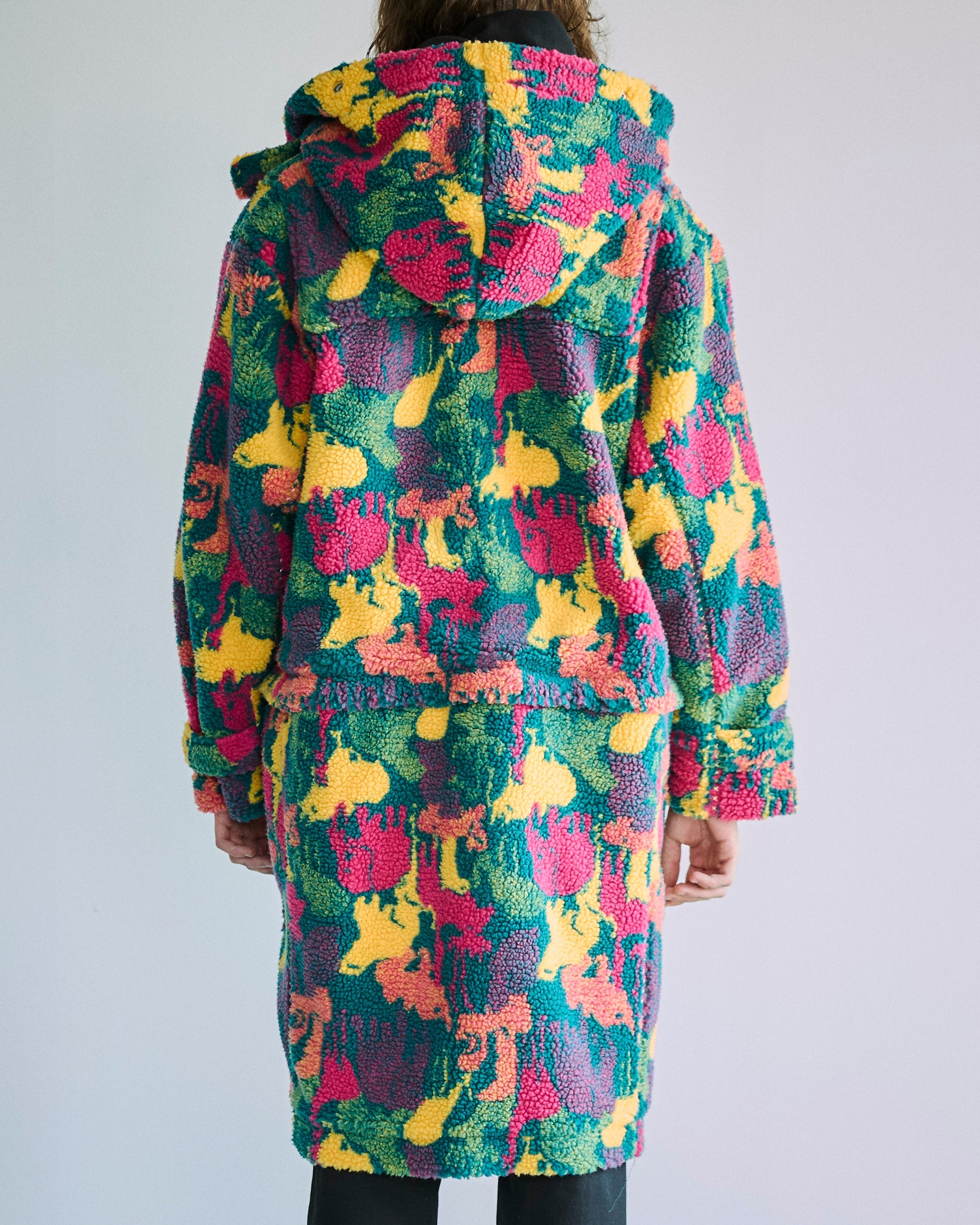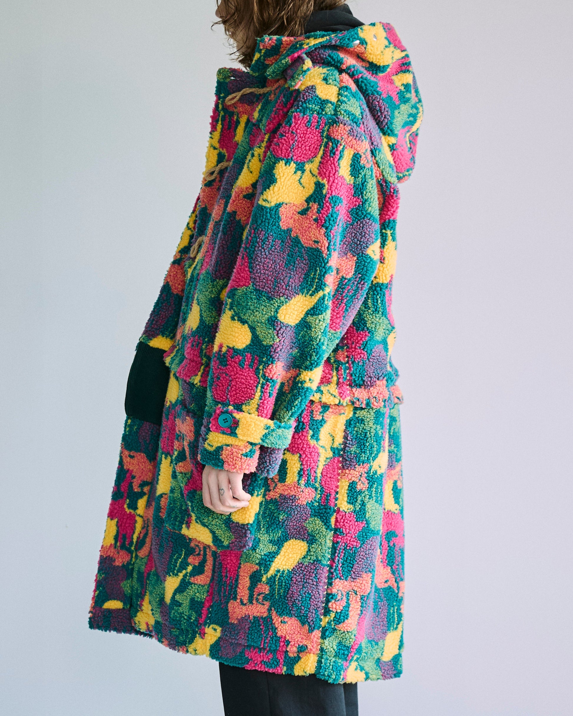 大胆なマルチカラーのアニマル柄ボアで仕立てた、存在感抜群のアウター。