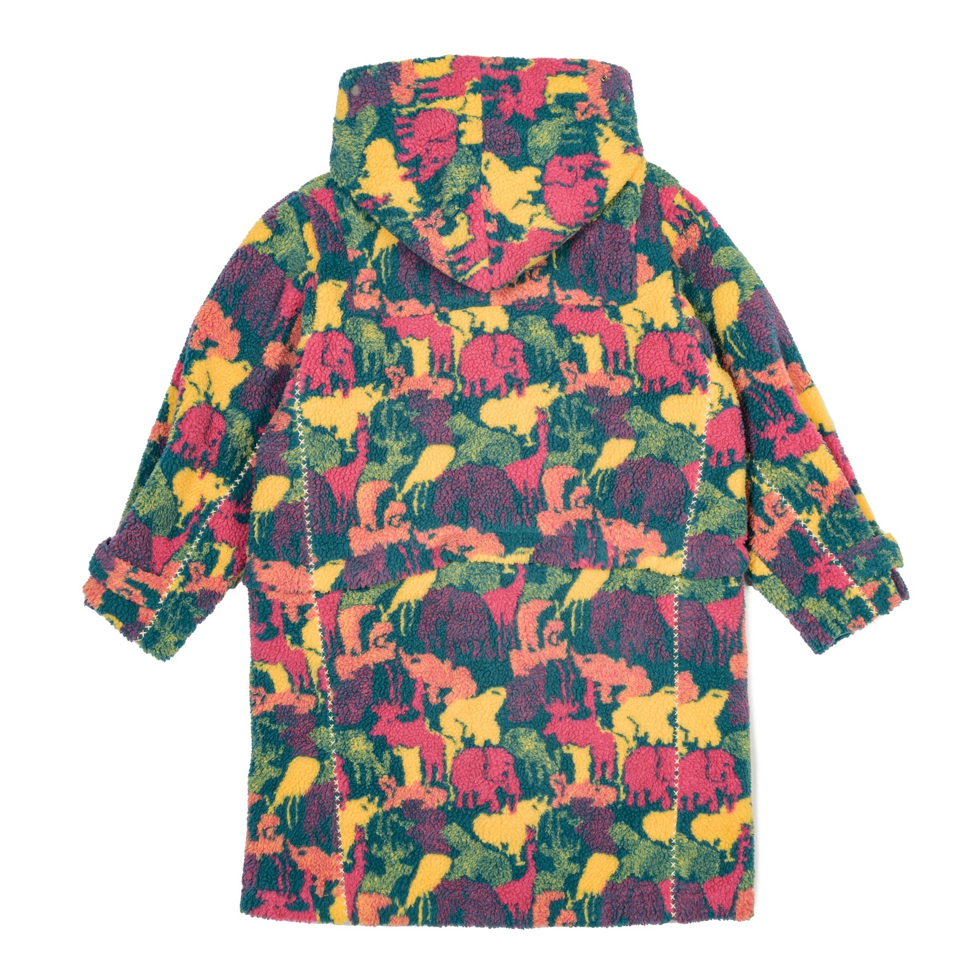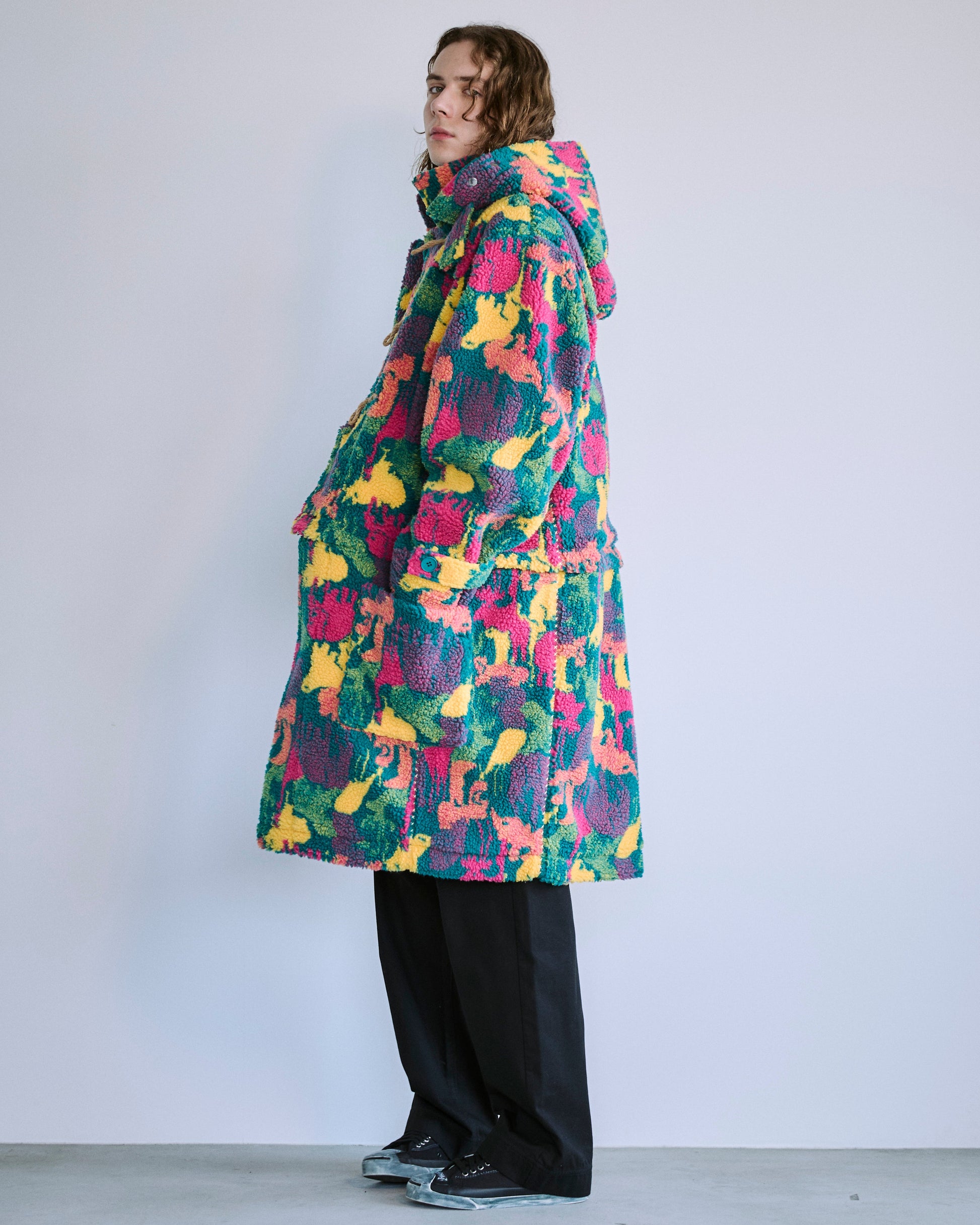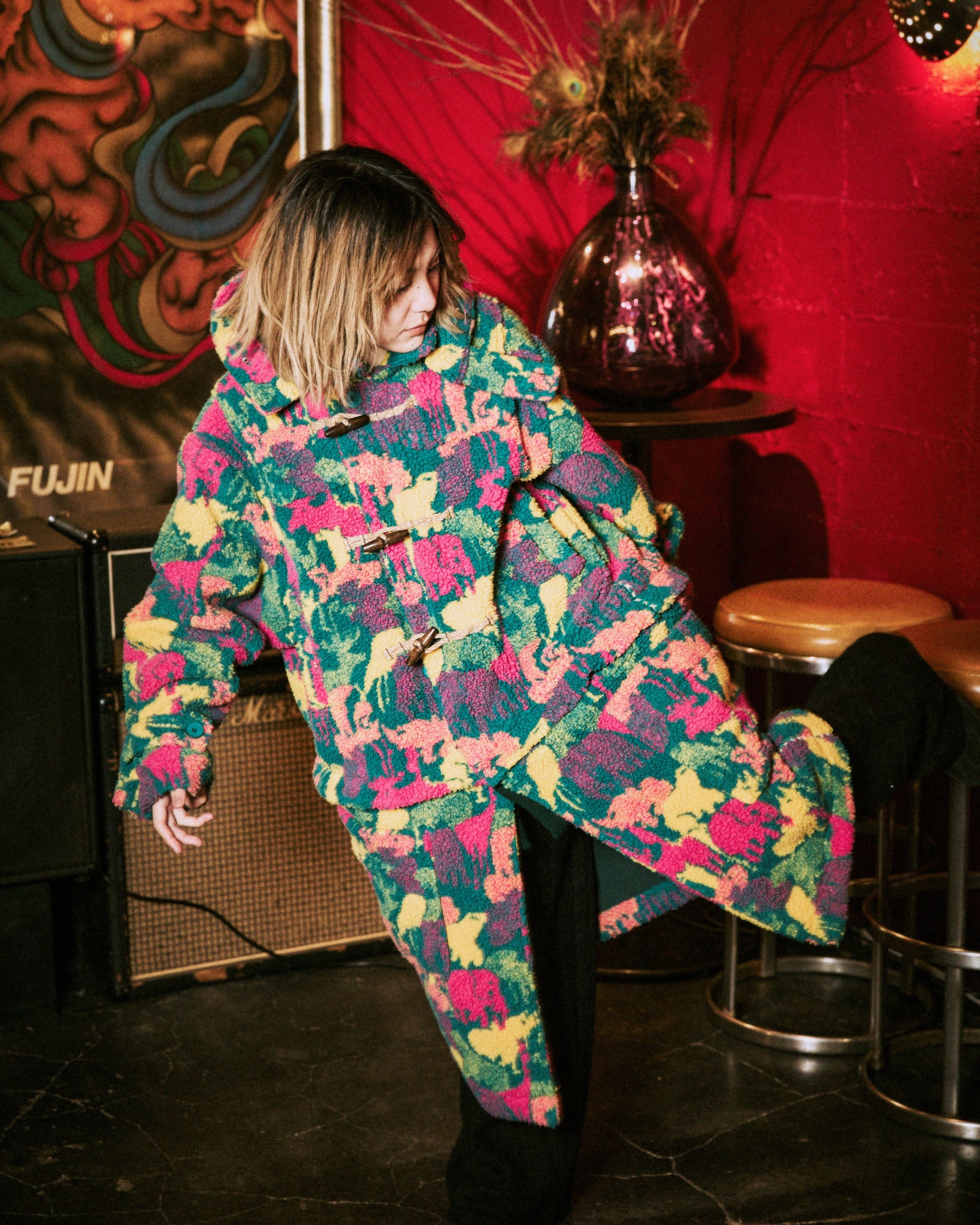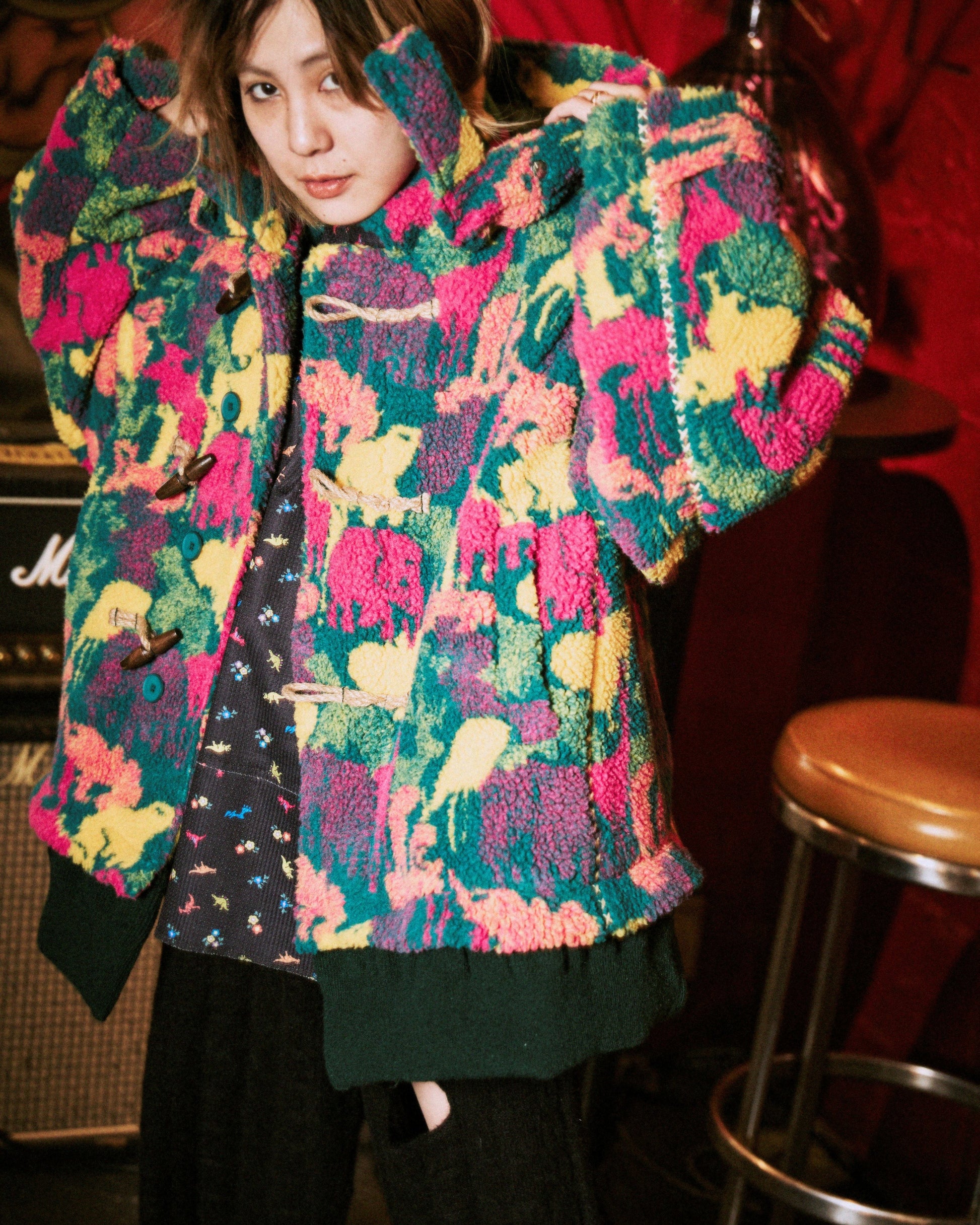 大胆なマルチカラーのアニマル柄ボアで仕立てた、存在感抜群のアウター。