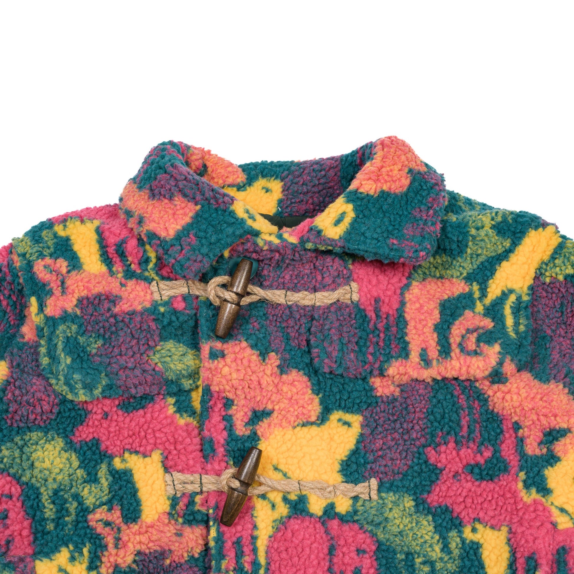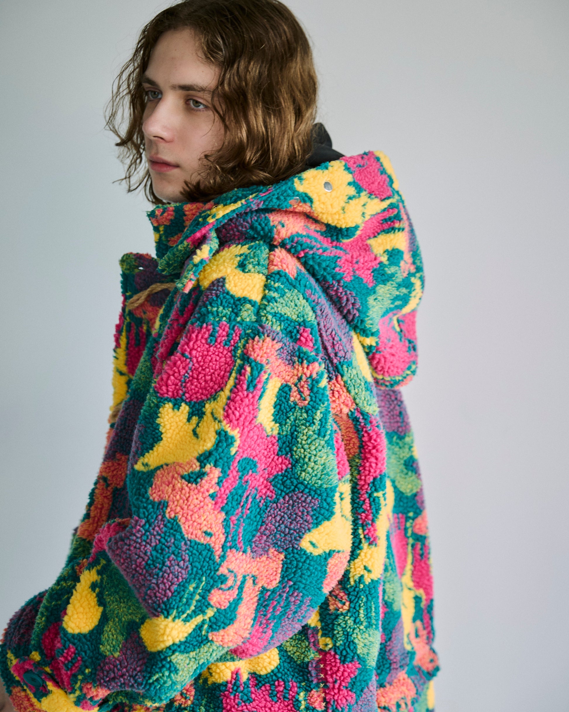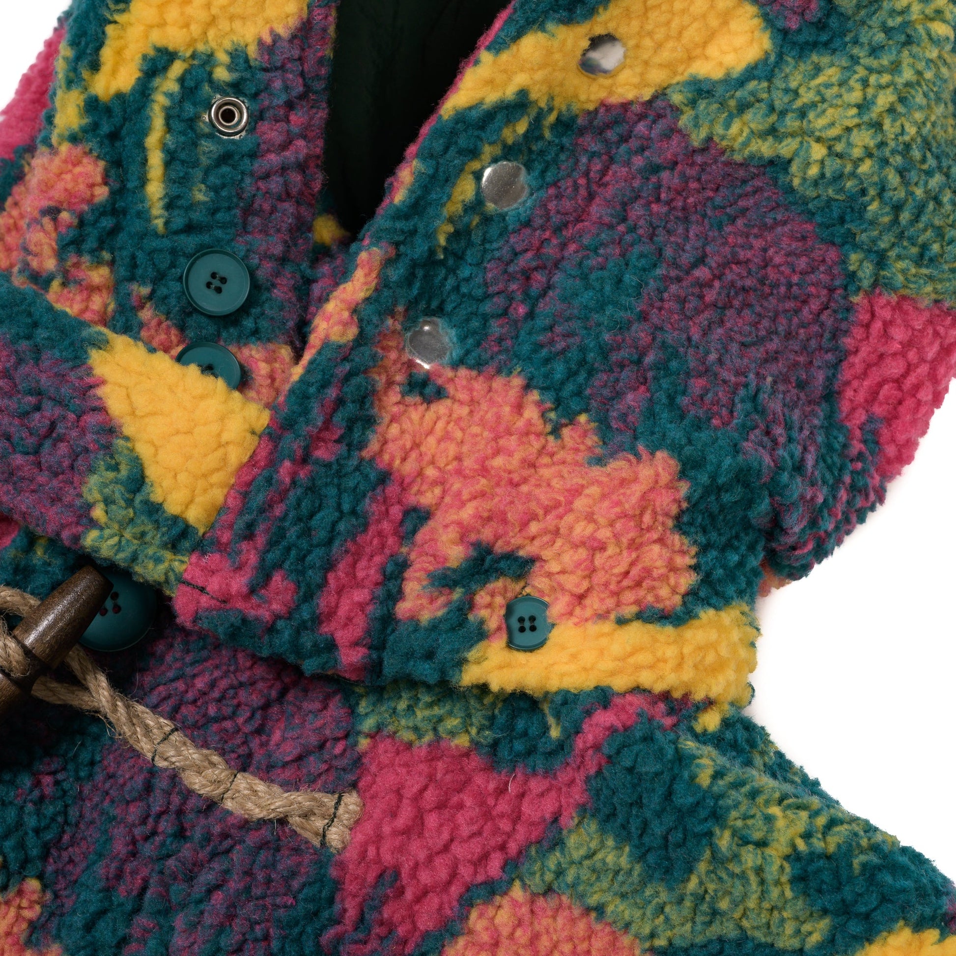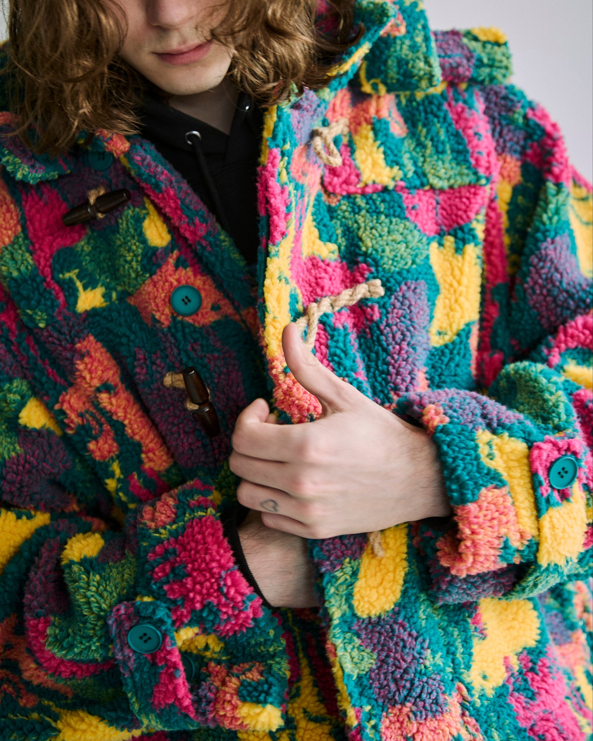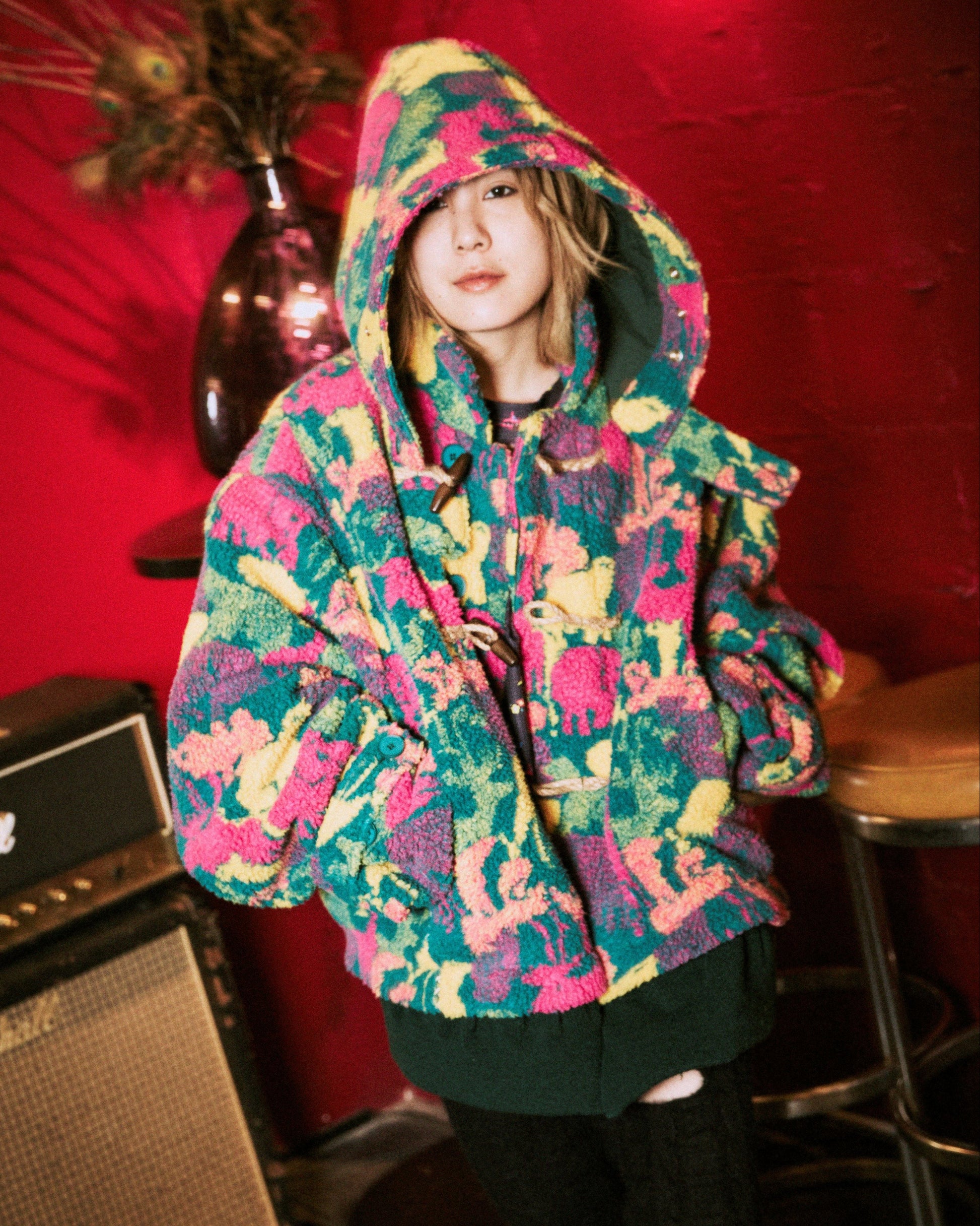 大胆なマルチカラーのアニマル柄ボアで仕立てた、存在感抜群のアウター。